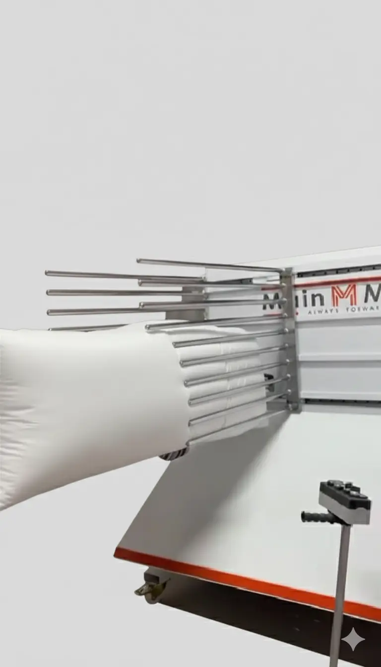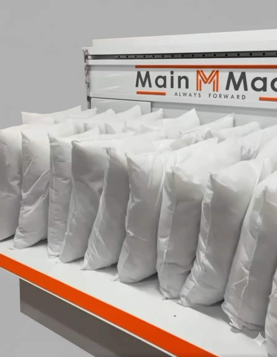 Tekstil ve uyku ürünleri sektöründe hız, kalite ve verimlilik her şeydir. Main Mach olarak geliştirdiğimiz yastık çuvallama makinesi, üretim hattınızın en kritik aşaması olan paketleme sürecini bir yük olmaktan çıkarıp rekabet avantajına dönüştürür. Geleneksel paketleme yöntemlerinin getirdiği zaman kaybı ve personel maliyetini minimize eden bu sistem, işletmenizin seri üretim kapasitesini maksimuma çıkarır.